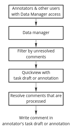 The Comments feature allows Annotators Reviewers and other higher roles to communicate and discuss queries on Label Studio Enterprise. Users will be notified of comments if they are associated with the task, and new comments will show up in the Notifications panel for a quick reference. Users can also filter and sort tasks by Comments status in the Data Manager view, such as finding tasks with unresolved comments from a particular user.